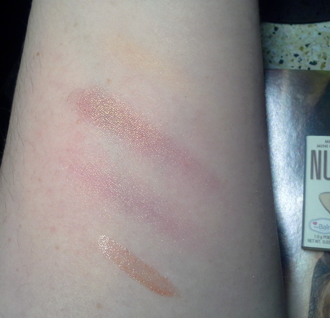 Top to bottom: MICABeauty Eye Primer, Nude Dude Eyeshadow with primer, Nude Dude Eyeshadow without primer, Starlooks Lip Gloss